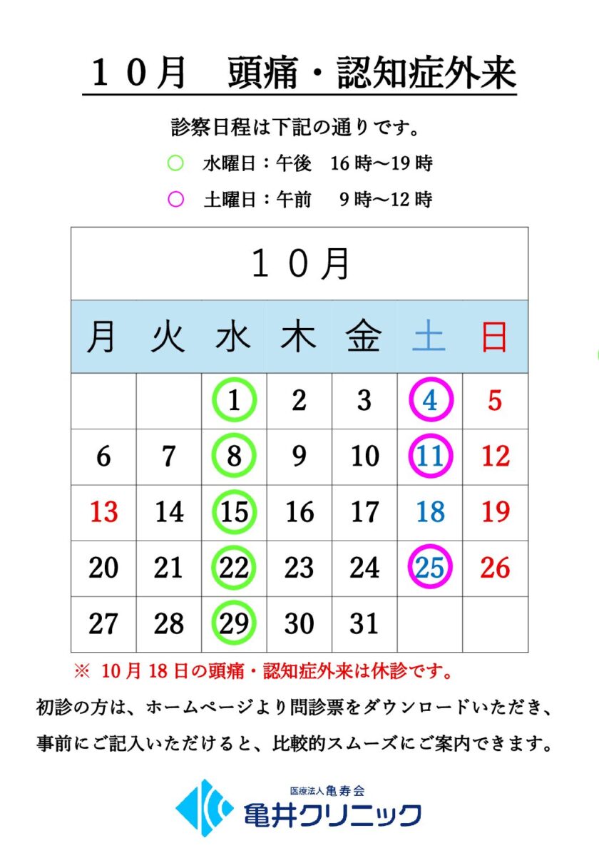 10月の頭痛・認知症外来のご案内