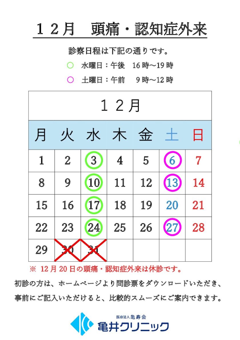 12月 頭痛・認知症外来のご案内